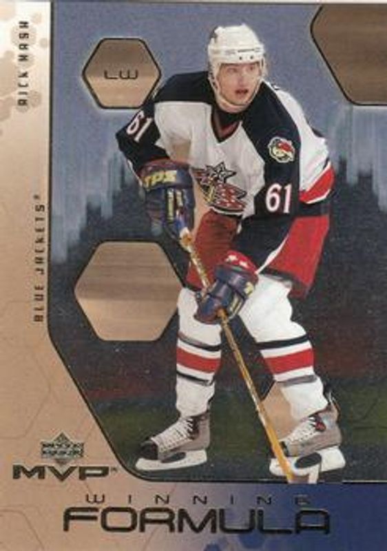 The Rick Nash 2003 Upper Deck MVP #WF1 Winning Formula card is 1 of 7 Rick Nash's card variations in the 2003 Upper Deck MVP set being tracked by Sports Card Investor, including Base, Silver Script /150, Gold Script /25, Red Script /25, and SportsNut.