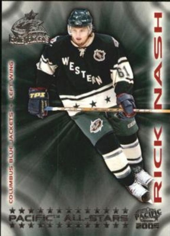 The Rick Nash 2004 Pacific #4 All Stars card is 1 of 6 Rick Nash's card variations in the 2004 Pacific set being tracked by Sports Card Investor, including Base, Red, Blue /250, 2004 NHL All Star Game Used Goal Nets /250, and Cramer's Choice /99.