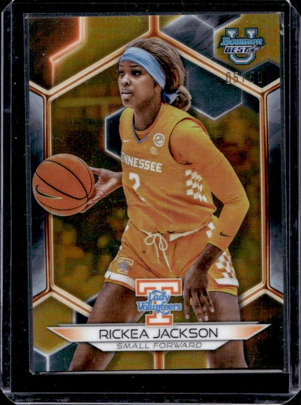 The Rickea Jackson 2023 Bowman Best University #80 Gold Refractor /50 card is 1 of 27 Rickea Jackson's card variations in the 2023 Bowman Best University set being tracked by Sports Card Investor, including Base, Refractor, Speckle Refractor, Blue Refractor /150, and Pink Lava Refractor /100.