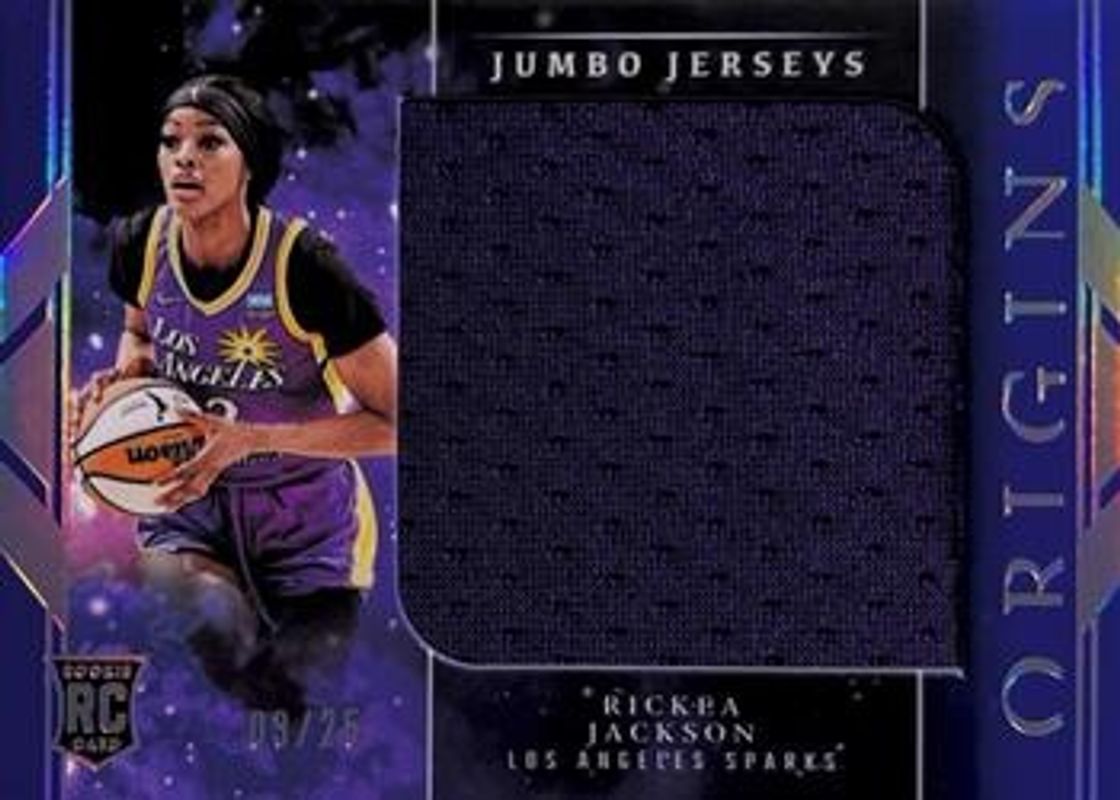 The Rickea Jackson 2024 Origins WNBA #JJ-RJ Jumbo Jerseys - Blue /25 Rookie card is 1 of 33 Rickea Jackson's card variations in the 2024 Origins WNBA set being tracked by Sports Card Investor, including Base, Red /99, Blue /75, Swirl /(SSP), and Teal /49.