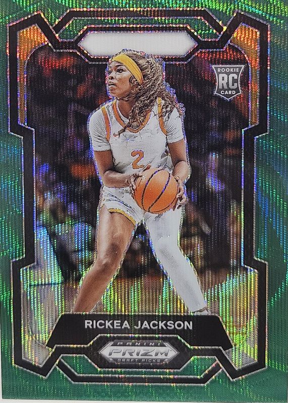 The Rickea Jackson 2024 Prizm Draft Picks #44 Green Wave Rookie card in Raw condition has not changed in price in the last 30 days and was last sold for $3.25 .
