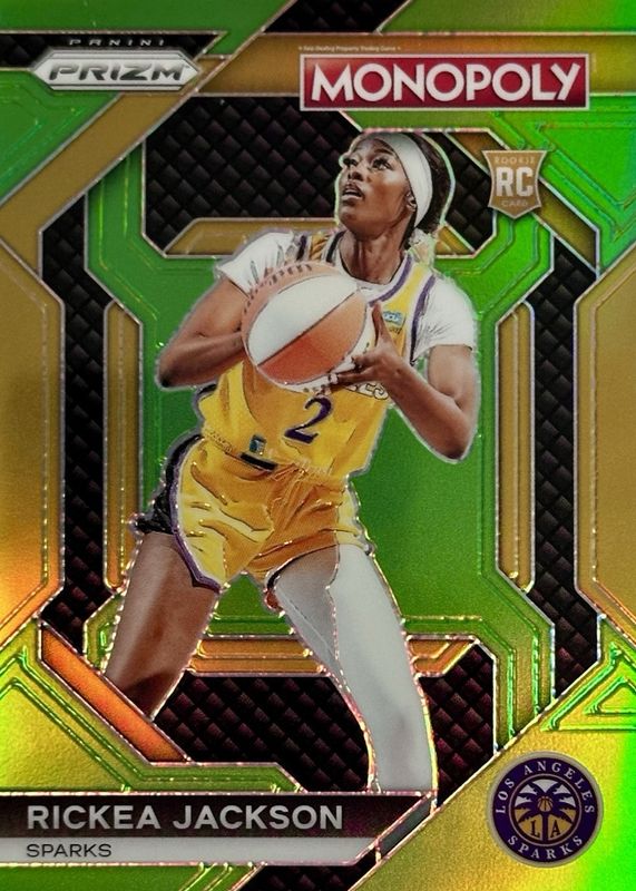 The Rickea Jackson 2024 Prizm Monopoly WNBA #WNBA25 Insert - Neon Green /10 Rookie card in Raw condition has not changed in price in the last 30 days and was last sold for $85.00 .