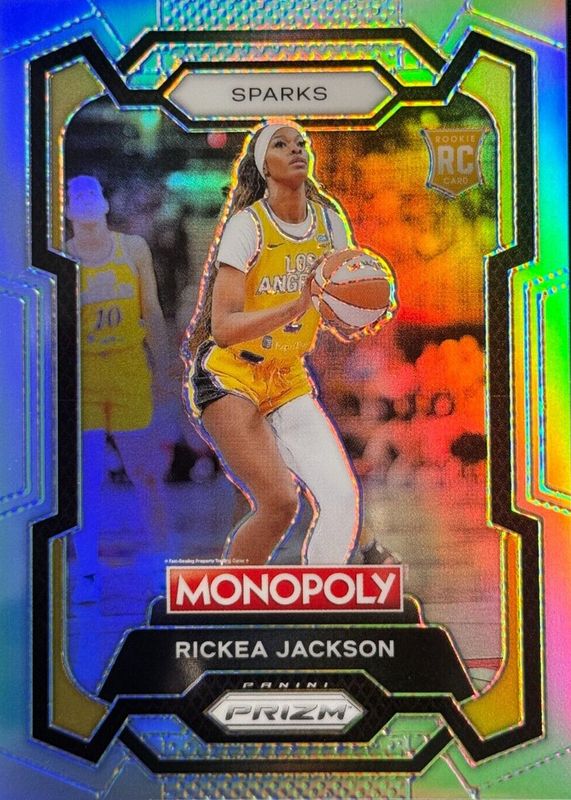 The Rickea Jackson 2024 Prizm Monopoly WNBA #63 Light Blue /199 Rookie card in Raw condition has not changed in price in the last 30 days and was last sold for $20.00 .