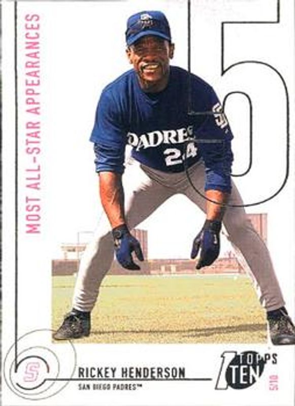 The Rickey Henderson 2002 Topps Ten #115 Base card is 1 of 2 Rickey Henderson's card variations in the 2002 Topps Ten set being tracked by Sports Card Investor, including Die-Cut.