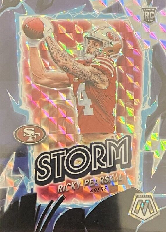 The Ricky Pearsall 2024 Mosaic #8 Storm - Mosaic Rookie card in Raw condition has not changed in price in the last 30 days and was last sold for $5.00 .