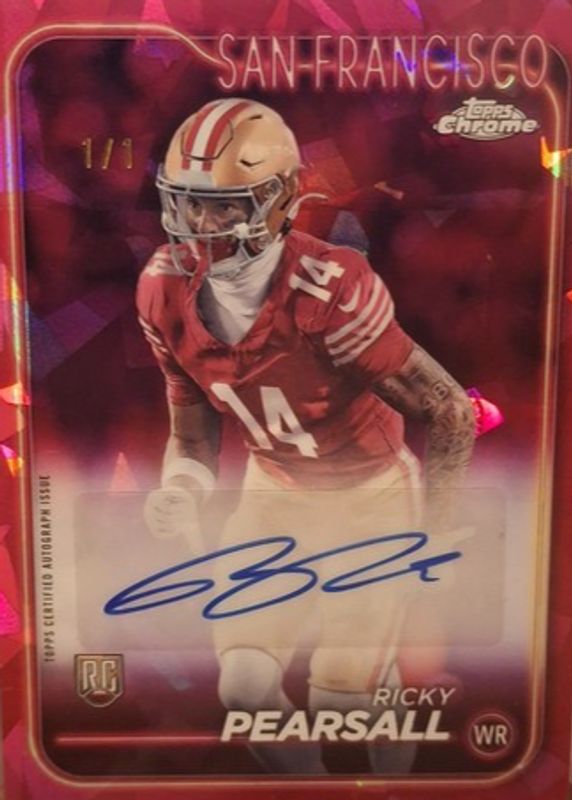 The Ricky Pearsall 2024 Topps Chrome Sapphire Edition #RA-RPE Rookie Autographs - Padparadscha /1 card in Raw condition has not changed in price in the last 30 days and was last sold for $550.00 .