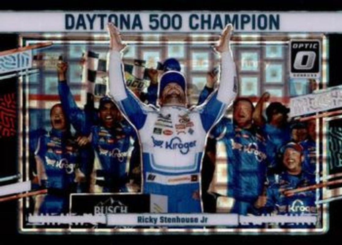 The Ricky Stenhouse Jr. 2024 Donruss NASCAR #171 Optic Black Pandora card is 1 of 97 Ricky Stenhouse Jr.'s card variations in the 2024 Donruss NASCAR set being tracked by Sports Card Investor, including #54b Base, #171 Base, #54a Base, #171 Optic, and #54 Optic.