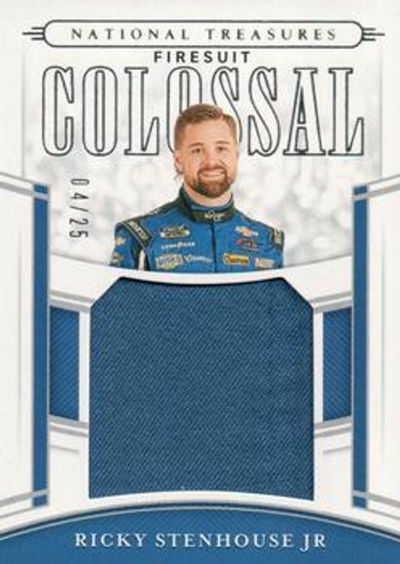 The Ricky Stenhouse 2020 National Treasures NASCAR #CRU-RS Colossal Race Used Firesuits /25 card is 1 of 103 Ricky Stenhouse's card variations in the 2020 National Treasures NASCAR set being tracked by Sports Card Investor, including #60 Base /25, #21 Base /25, #21 Holo Silver /15, #60 Holo Silver /15, and #21 Holo Gold /10.