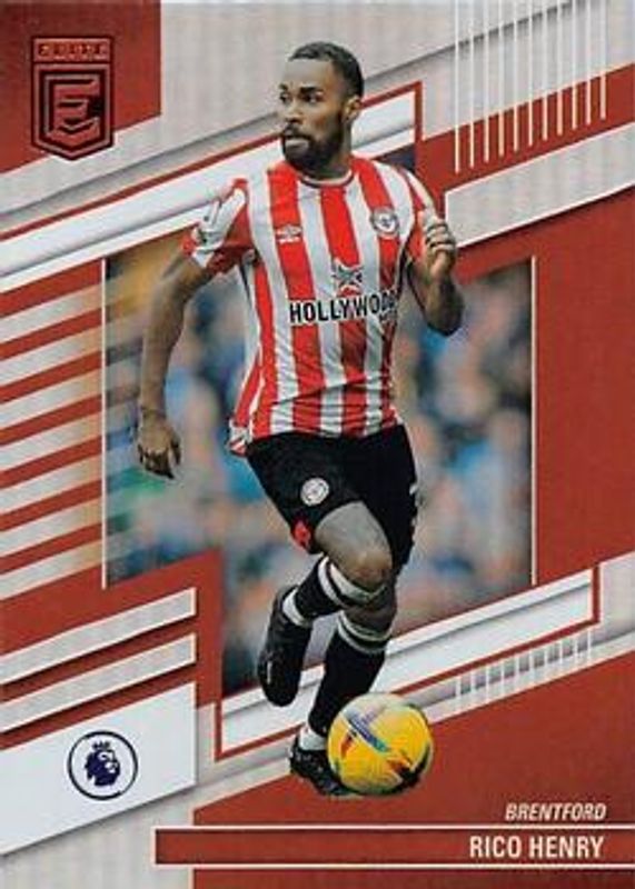 The Rico Henry 2022 Elite Premier League EPL #38 Base card is 1 of 42 Rico Henry's card variations in the 2022 Elite Premier League EPL set being tracked by Sports Card Investor, including Aspirations, Disco Red, Red, Status, and Disco Orange /35.