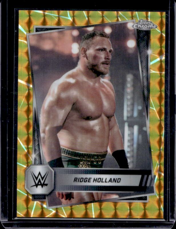 The Ridge Holland 2025 Topps Chrome WWE #82 Gold Geometric Refractor /50 card is 1 of 36 Ridge Holland's card variations in the 2025 Topps Chrome WWE set being tracked by Sports Card Investor, including Base, Black & Gold Refractor, Geometric Refractor, Neon Green & Black Refractor, and Pink Shimmer Refractor.
