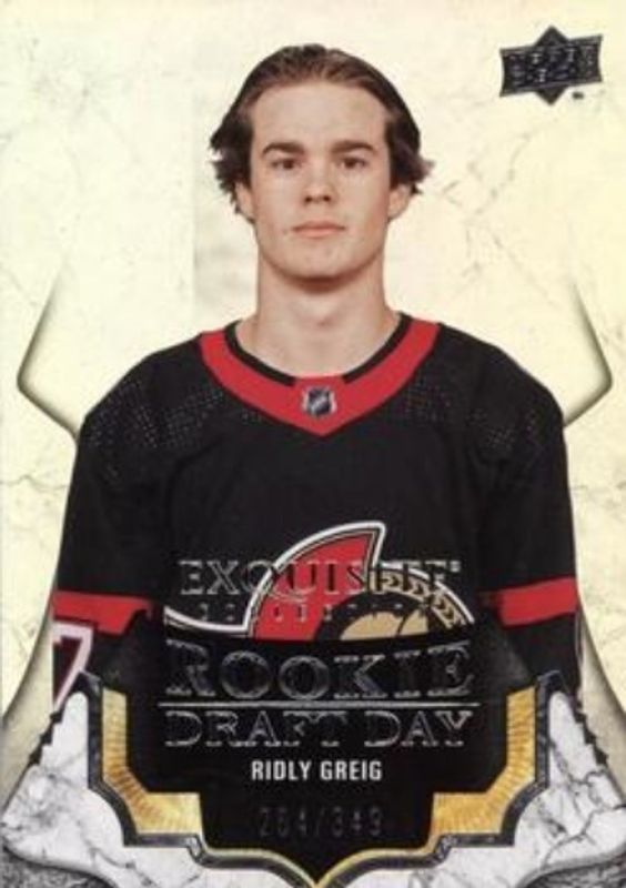 The Ridly Greig 2023 Upper Deck Black Diamond #RDD-RG Exquisite Collection Rookie Draft Day /349 card is 1 of 57 Ridly Greig's card variations in the 2023 Upper Deck Black Diamond set being tracked by Sports Card Investor, including Base /349, Red /75, Blue /25, Pure Black Auto /25, and Green /10.