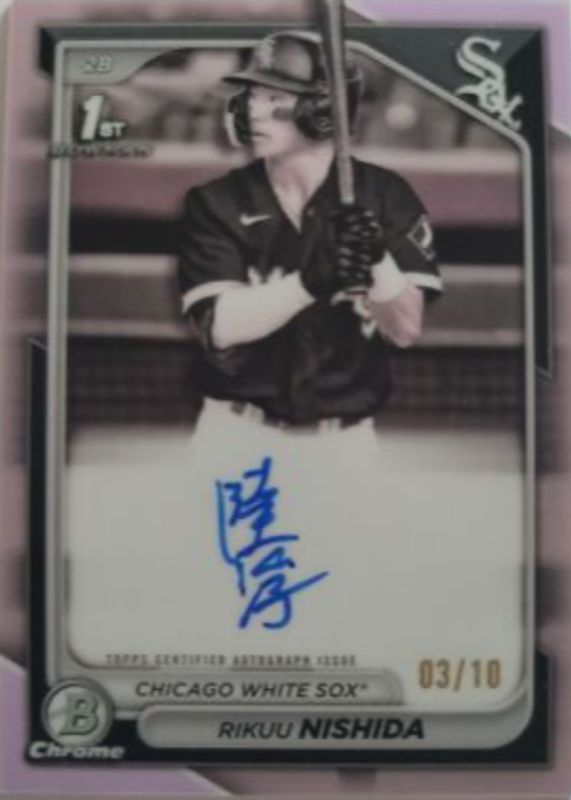 The Rikuu Nishida 2024 Bowman #CPA-RN Chrome Prospect Auto - Pearl Refractor /10 (1st) card in Raw condition has not changed in price in the last 30 days and was last sold for $521.11 .