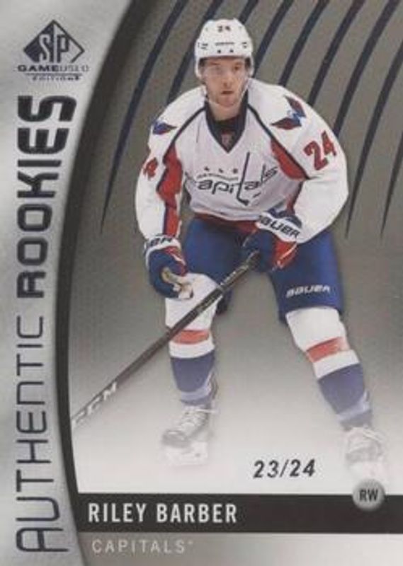 The Riley Barber 2017 SP Game Used #131 Base /73 Rookie card is 1 of 12 Riley Barber's card variations in the 2017 SP Game Used set being tracked by Sports Card Investor, including Blue Autographs, Red Autographed Jerseys, Gold Jerseys /399, Authentic Rookies Rainbow /218, and Orange Rainbow /113.