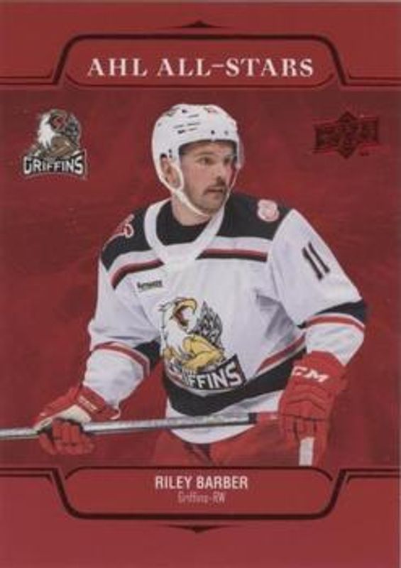 The Riley Barber 2021 Upper Deck AHL #AS-22 AHL All Stars - Red card is 1 of 13 Riley Barber's card variations in the 2021 Upper Deck AHL set being tracked by Sports Card Investor, including Base, Exclusives /100, High Gloss /10, AHL All Stars, and AHL All Stars Autographs.
