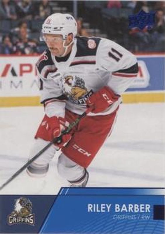The Riley Barber 2021 Upper Deck AHL #18 Blue card is 1 of 13 Riley Barber's card variations in the 2021 Upper Deck AHL set being tracked by Sports Card Investor, including Base, Exclusives /100, High Gloss /10, AHL All Stars, and AHL All Stars Autographs.