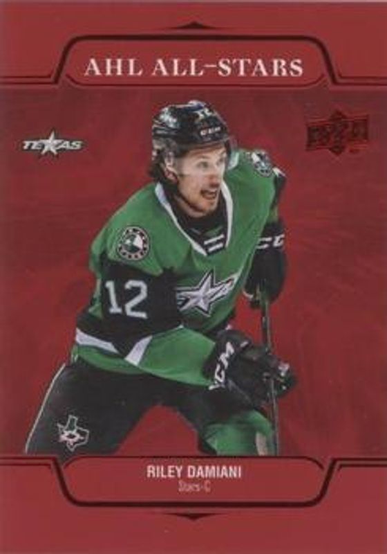 The Riley Damiani 2021 Upper Deck AHL #AS-23 AHL All Stars - Red Rookie card is 1 of 15 Riley Damiani's card variations in the 2021 Upper Deck AHL set being tracked by Sports Card Investor, including Base, Exclusives /100, High Gloss /10, AHL All Rookie Team, and AHL All Rookie Team Autographs.