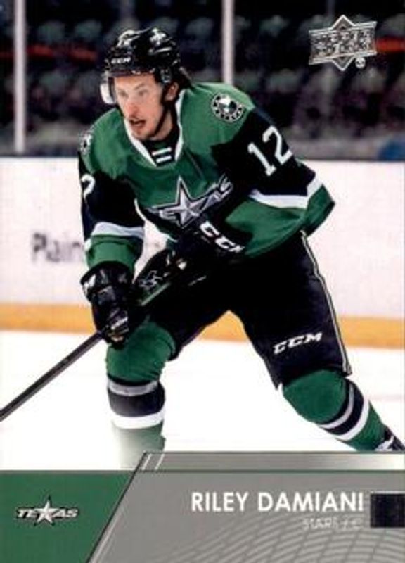 The Riley Damiani 2021 Upper Deck AHL #37 Base Rookie card is 1 of 15 Riley Damiani's card variations in the 2021 Upper Deck AHL set being tracked by Sports Card Investor, including Exclusives /100, High Gloss /10, AHL All Rookie Team, AHL All Rookie Team Autographs, and AHL All Rookie Team - Red.