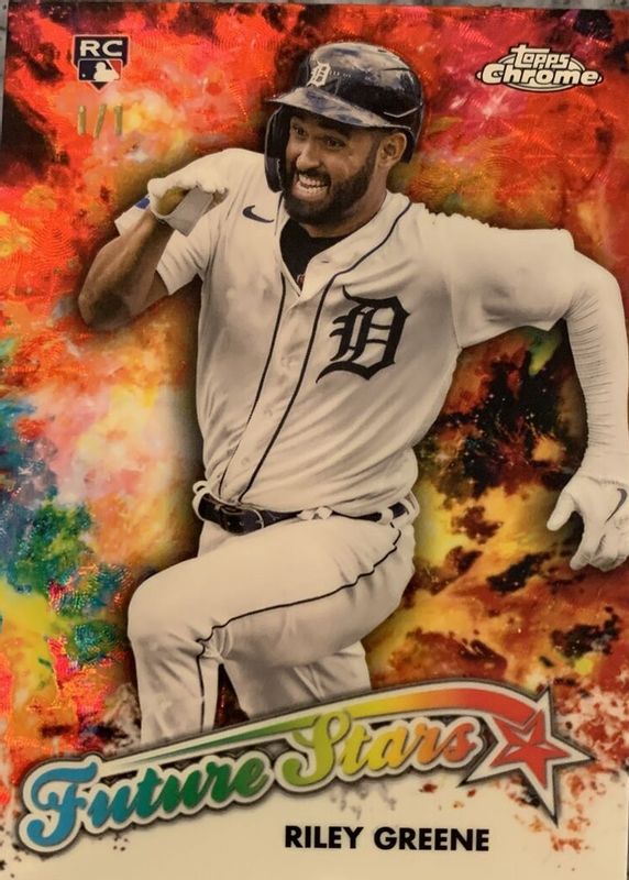 The Riley Greene 2023 Topps Chrome #FS-19 Future Stars - Superfractor /1 Rookie card in Raw condition has not changed in price in the last 30 days and was last sold for $1,499.99 .