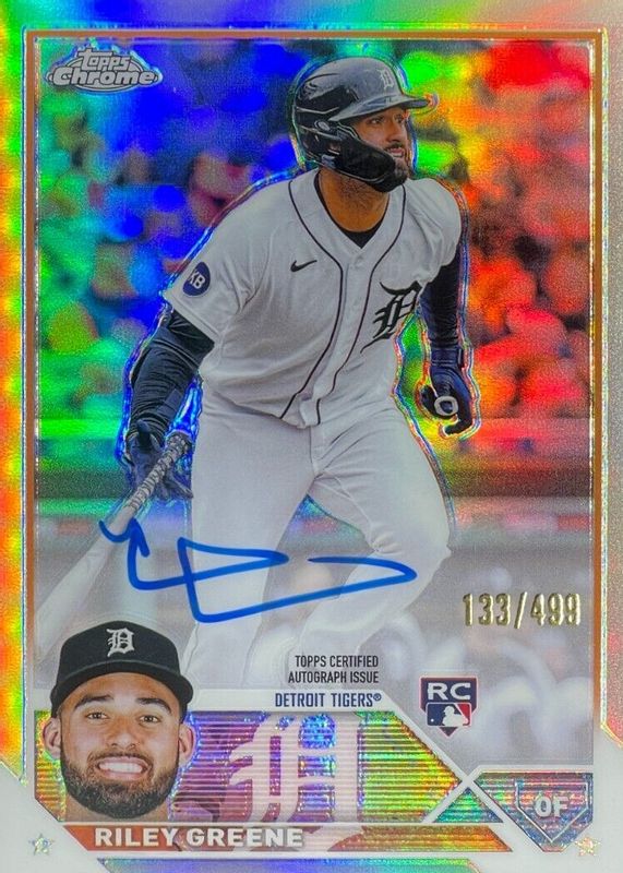 The Riley Greene 2023 Topps Chrome #RA-RG Rookie Autographs - Refractor /499 card in Raw condition has not changed in price in the last 30 days and was last sold for $72.50 .