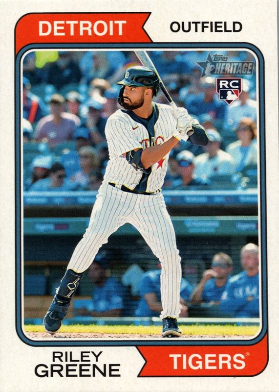 The Riley Greene 2023 Topps Heritage #48 Throwback Uniform Variation Rookie card in Raw condition has not changed in price in the last 30 days and was last sold for $418.80 .