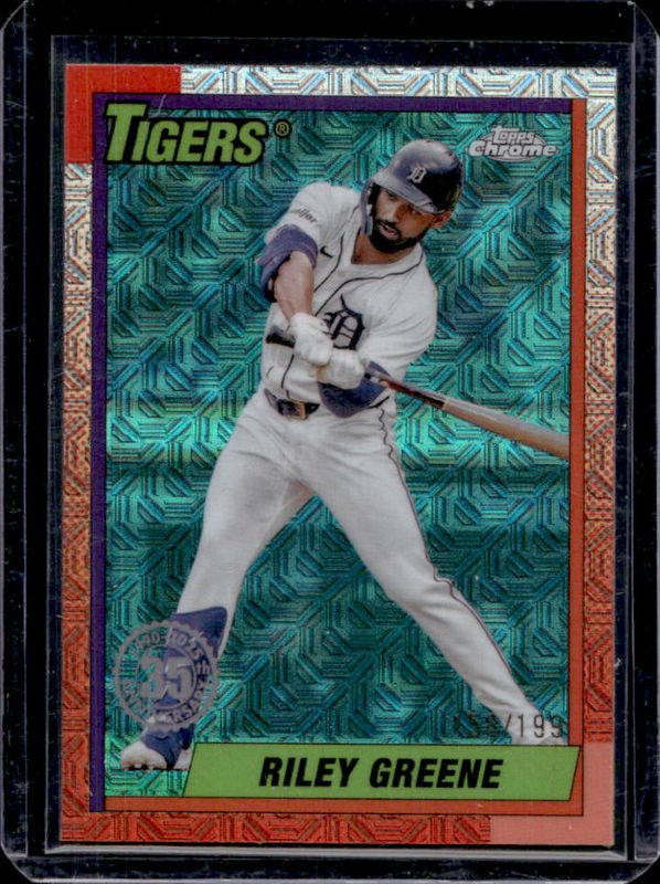 The Riley Greene 2025 Topps #T90C-89 1990 Baseball Chrome Silver Pack - Aqua Refractor /199 card is 1 of 137 Riley Greene's card variations in the 2025 Topps set being tracked by Sports Card Investor, including Base, Aqua Holo Foil, Diamante Foil, Holo Foil, and Pink Diamante Foil.