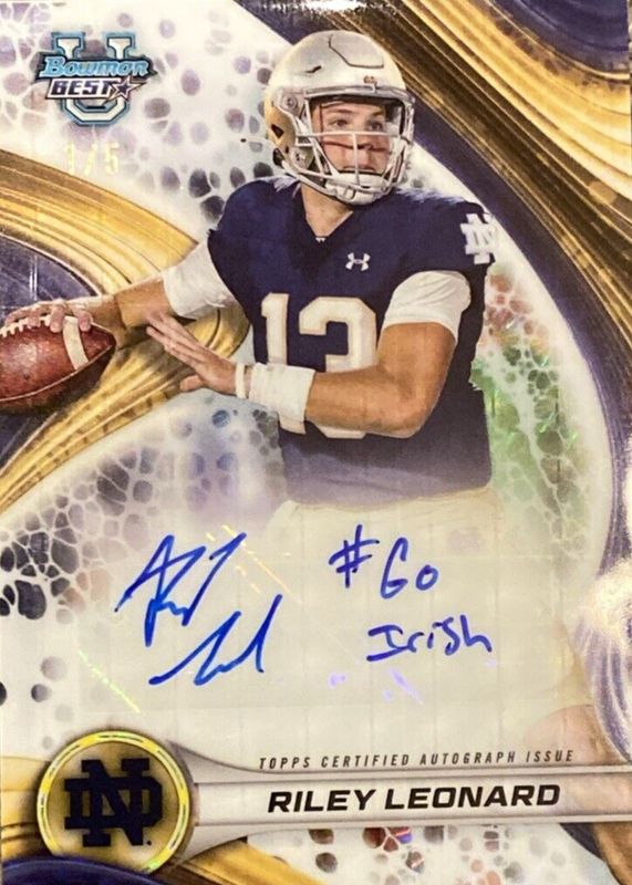 The Riley Leonard 2024 Bowman Best University #BOA-RL Best of 2024 Autographs - White Refractor /5 card in Raw condition has not changed in price in the last 30 days and was last sold for $135.83 .