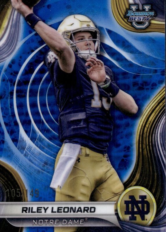 This card is 1 of 35 Riley Leonard's card variations in the 2024 Bowman Best University set being tracked by Sports Card Investor, including Base, Refractor, Speckle Refractor, Aqua Refractor /225, and Purple Refractor /125.