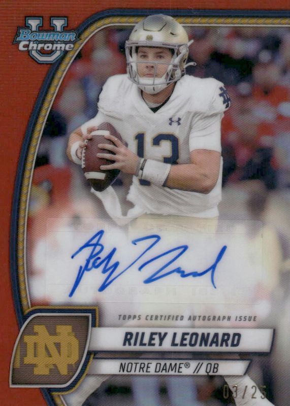 This card is 1 of 17 Riley Leonard's card variations in the 2024 Bowman Chrome University set being tracked by Sports Card Investor, including Image Variation, Prospect Auto, Prospect Auto - Stealth Refractor, Prospect Auto - Refractor /299, and Prospect Auto - Fuchsia Refractor /150.