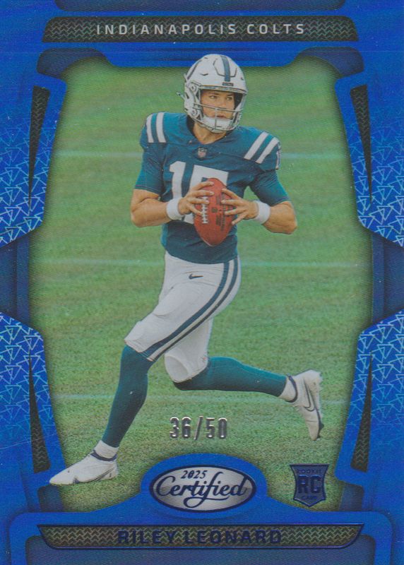 The Riley Leonard 2025 Certified #137 Mirror Blue /50 Rookie card in Raw condition has not changed in price in the last 30 days and was last sold for $5.00 .
