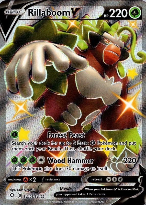 The Rillaboom V 2021 Sword & Shield: Shining Fates #SV105 Shiny Rare (Full Art) card in Raw TCG (Near Mint) condition has moved down -$0.05 (-2.5%) in the last 30 days and was last sold for $1.97 .