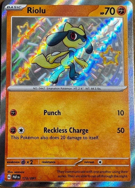 The Riolu 2024 Scarlet & Violet: Paldean Fates #173/091 Shiny Rare card in Raw TCG (Lightly Played) condition has not changed in price in the last 30 days and was last sold for $6.99 .