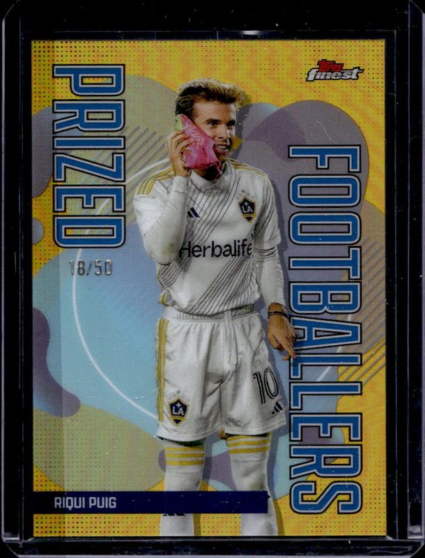 The Riqui Puig 2024 Topps Finest MLS #PF-2 Prized Footballers - Gold Refractor /50 card is 1 of 71 Riqui Puig's card variations in the 2024 Topps Finest MLS set being tracked by Sports Card Investor, including #100 Base, #160 Base, #202 Base, #160 Aqua Refractor, and #202 Aqua Refractor.