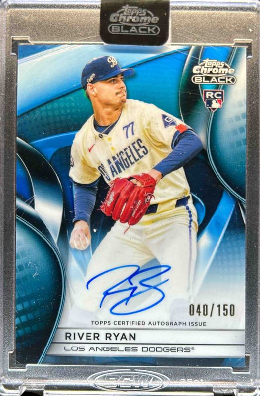 The River Ryan 2025 Topps Chrome Black #CBA-RR Autographs - Blue Refractor /150 Rookie card is 1 of 35 River Ryan's card variations in the 2025 Topps Chrome Black set being tracked by Sports Card Investor, including Base, Refractor /199, Blue Lava Refractor /150, Blue Refractor /150, and Green Refractor /99.