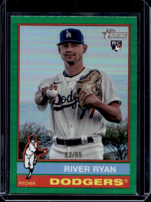 The River Ryan 2025 Topps Heritage #45 Chrome - Green Refractor /99 Rookie card is 1 of 24 River Ryan's card variations in the 2025 Topps Heritage set being tracked by Sports Card Investor, including Base, Black Border, Dark Blue Border, Dark Green Border, and Dark Yellow Border.