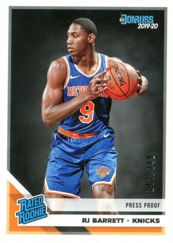 The RJ Barrett 2019 Donruss #203 Press Proof Silver /349 Rookie card in Raw condition has not changed in price in the last 30 days and was last sold for $10.00 .