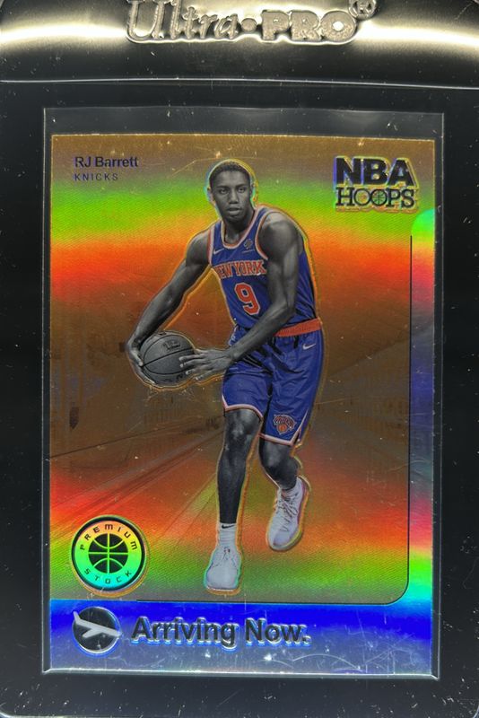 The RJ Barrett 2019 Hoops Premium Stock #4 Arriving Now. - Holo Rookie card is 1 of 84 RJ Barrett's card variations in the 2019 Hoops Premium Stock set being tracked by Sports Card Investor, including #201b Base, #201 Base, #201 Flash, #298 Flash, and #201 Pulsar.