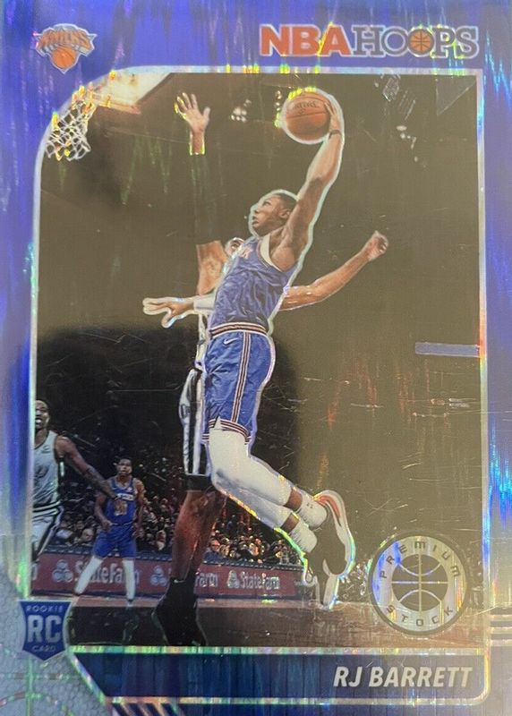 The RJ Barrett 2019 Hoops Premium Stock #201 Blue Flash /49 Rookie card in Raw condition has not changed in price in the last 30 days and was last sold for $61.00 .