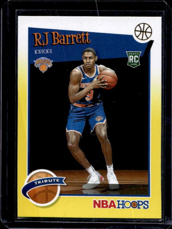 The RJ Barrett 2019 Hoops #298 Yellow Rookie card is 1 of 58 RJ Barrett's card variations in the 2019 Hoops set being tracked by Sports Card Investor, including #201 Base, #298 Base, #201 Premium Box Set /199, #298 Premium Box Set /199, and #201 Black Artist's Proof /1.