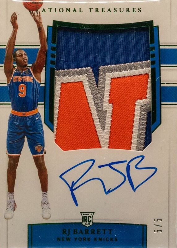 This card is 1 of 8 RJ Barrett's card variations in the 2019 National Treasures set being tracked by Sports Card Investor, including Rookie Patch Auto /99, Rookie Patch Auto - Stars & Stripes /30, Rookie Patch Auto - Gold /10, Rookie Patch Auto - Stars & Stripes Blue /3, and Rookie Patch Auto - Logoman /1.