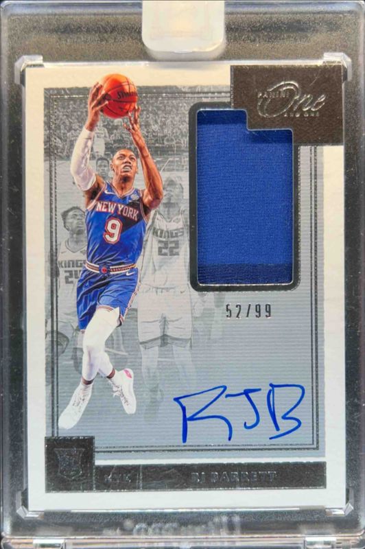 The RJ Barrett 2019 One and One #RJA-RJB Rookie Jersey Autographs /99 card is 1 of 40 RJ Barrett's card variations in the 2019 One and One set being tracked by Sports Card Investor, including Base /99, Blue /25, Purple /20, Red /15, and Gold /10.