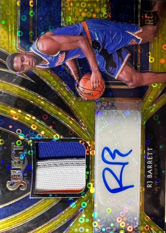 The RJ Barrett 2019 Select #RJA-RJB Rookie Jersey Autographs - Gold Disco /10 card in Raw condition has not changed in price in the last 30 days and was last sold for $143.99 .