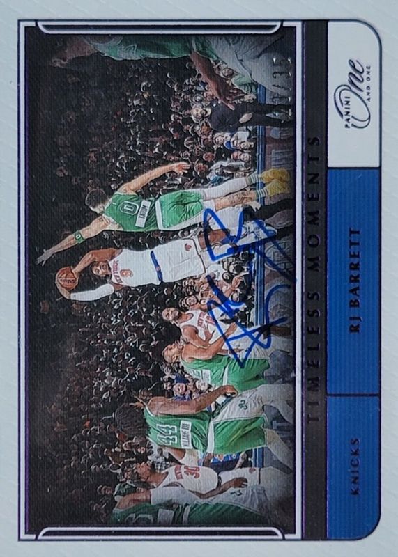 The RJ Barrett 2021 One and One #TM-RJB Timeless Moments Autographs - Purple /35 card in Raw condition has not changed in price in the last 30 days and was last sold for $317.00 .