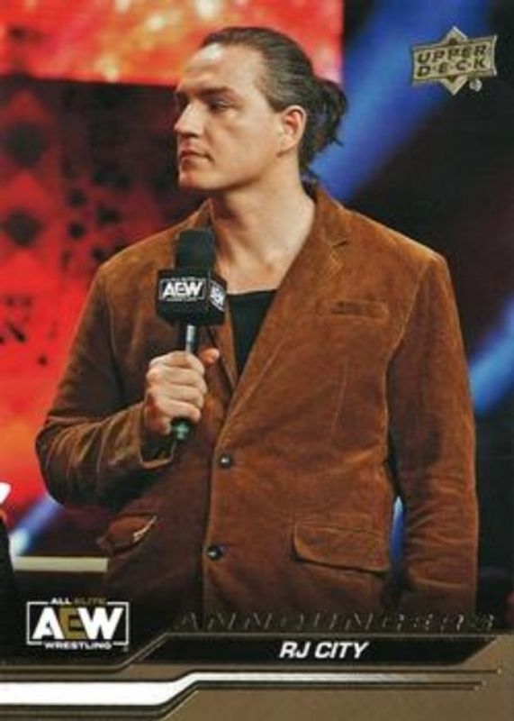 The RJ City 2024 Upper Deck AEW #100 Gold card is 1 of 20 RJ City's card variations in the 2024 Upper Deck AEW set being tracked by Sports Card Investor, including Base, Clear Cut, Diamond Plate, Outburst, and Pyro.