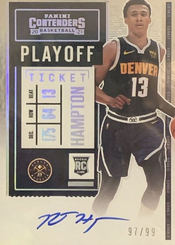 The RJ Hampton 2020 Contenders #104 Rookie Ticket Auto Variation - Playoff Ticket /99 (Blue Jersey) card in Raw condition has not changed in price in the last 30 days and was last sold for $0.99 .