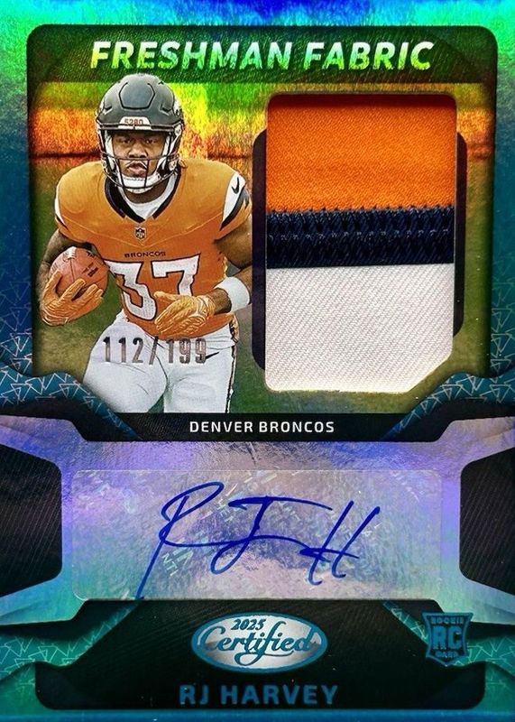The RJ Harvey 2025 Certified #FBC-RHY Freshman Fabric Signatures - Mirror Teal /199 Rookie card in Raw condition has moved up $21.95 (+168%) in the last 30 days and was last sold for $35.00 .