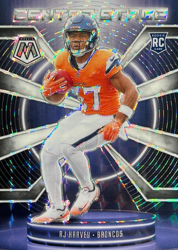 The RJ Harvey 2025 Mosaic #14 Center Stage - White /25 Rookie card in Raw condition has not changed in price in the last 30 days and was last sold for $15.50 .