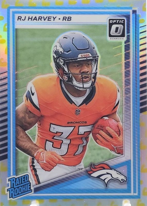 This card is 1 of 92 RJ Harvey's card variations in the 2025 Optic set being tracked by Sports Card Investor, including Base, Blue Hyper, Blue Scope, Green Hyper, and Green Velocity.