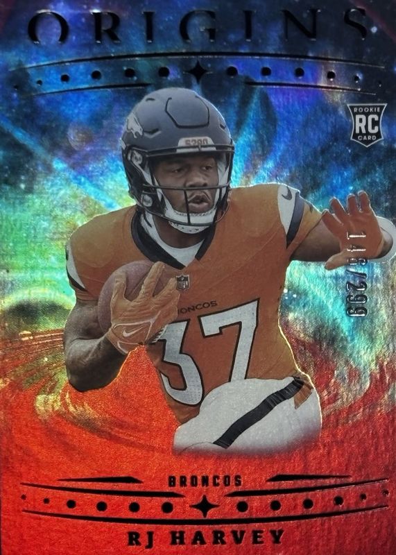 2025 Panini Origins RJ Harvey Holo Red /299 (RC) #141 Broncos