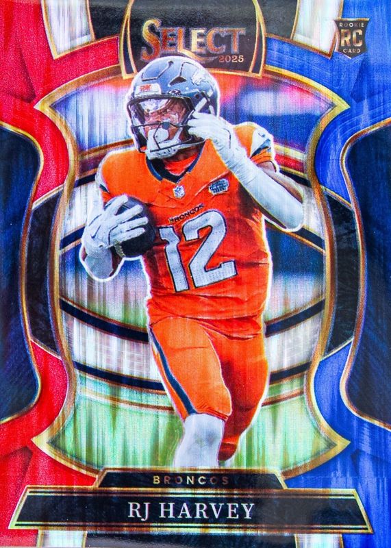 2025 Panini Select - Concourse RJ Harvey #10 Red & Blue Shock Prizm RC Broncos