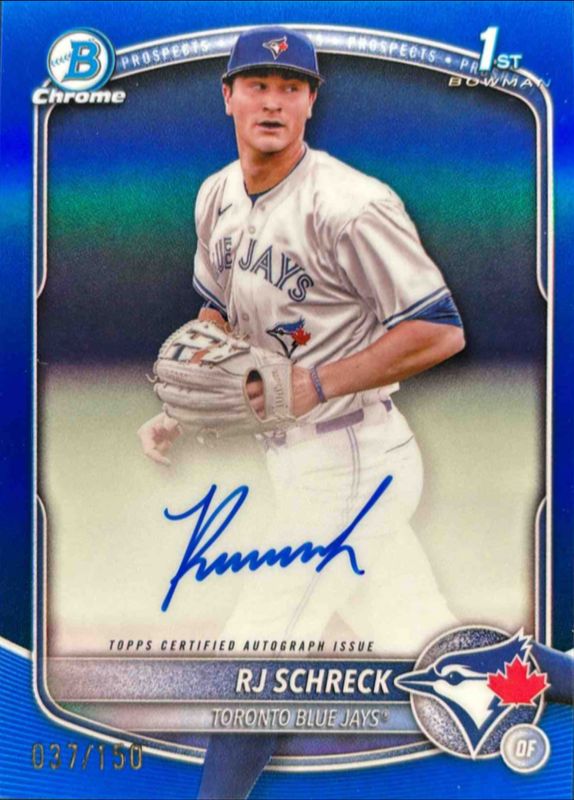 The RJ Schreck 2025 Bowman Chrome #CPA-RSC Prospect Auto - Blue Refractor /150 (1st) card in Raw condition has moved up $5.00 (+33.4%) in the last 30 days and was last sold for $19.99 .